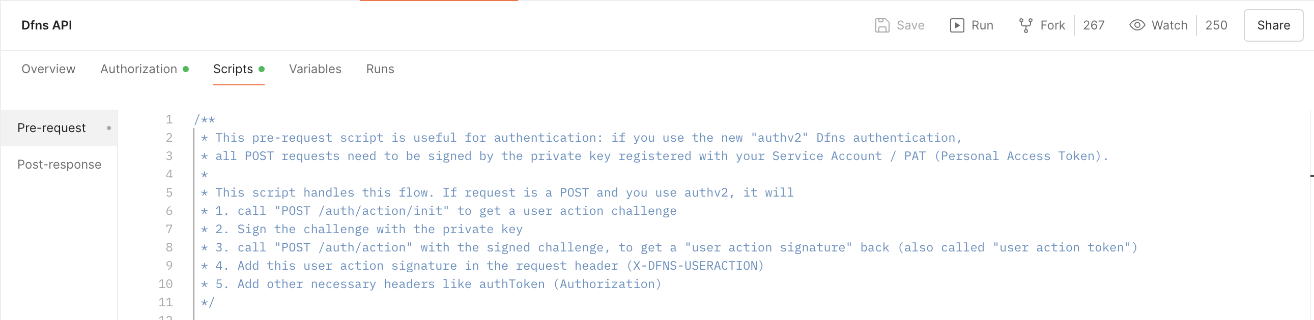 authv2 and one for authv1(deprecated)).Click on the one that you want to use (authv2 is recommended), and fill out the values in there (fill the Current Value column) with the values shown in the section below.When you’re done, set this environment as “Active” (meaning it will be used when you try endpoints) by clicking on the checkmark icon next to the environment name, or by selecting it in the dropdown selector in the top-right corner of Postman window.Values:dfnsApiDomain- Domain of Dfns API.api.dfns.ninjaorapi.dfns.ioauthToken- User PAT (Personal Access Token), or Service Account tokencredentialPrivateKey- Private key of the credentials registered during PAT/Service Account creation. Copy the key including all newlines into the variable
