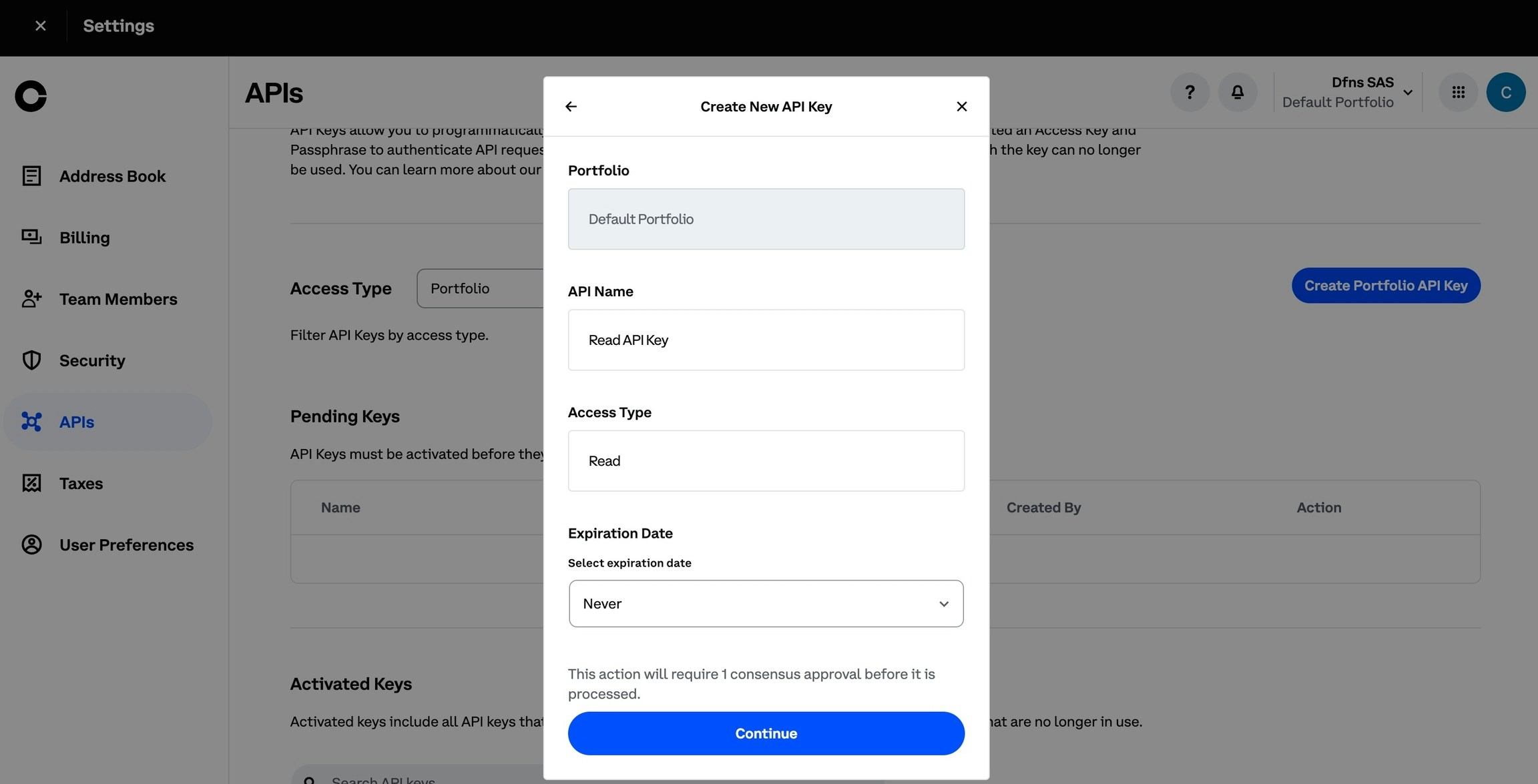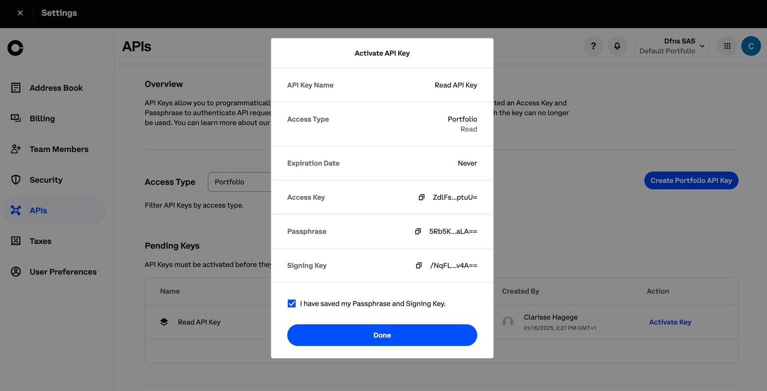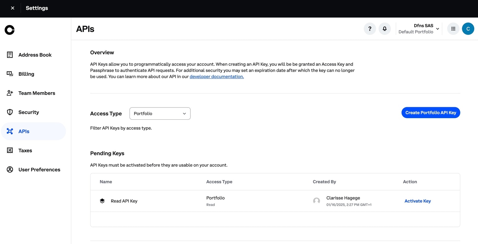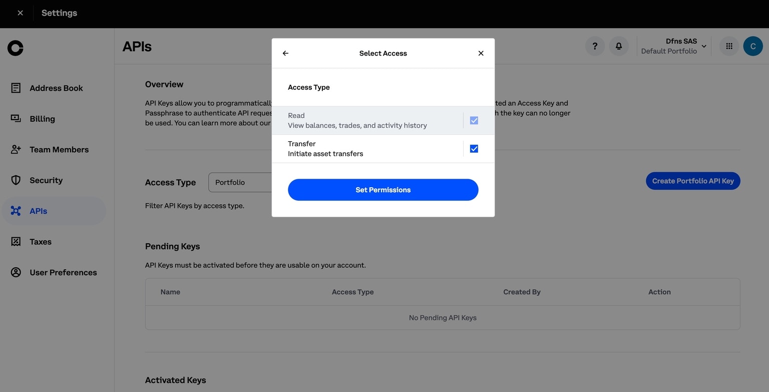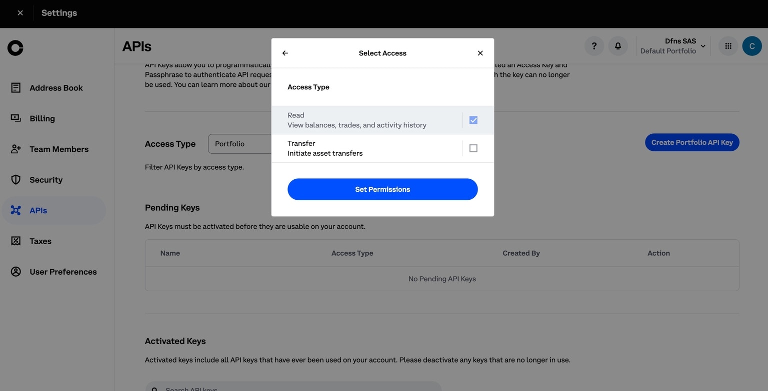 Log into your Coinbase Prime account and go to the Coinbase Prime homepage at https://prime.coinbase.com/. From here, click Settings under the profile icon in the left menu and then onAPI. Click Create Portfolio API Key and generate a Read only key by selecting only the Read permission within the Access Type screen: