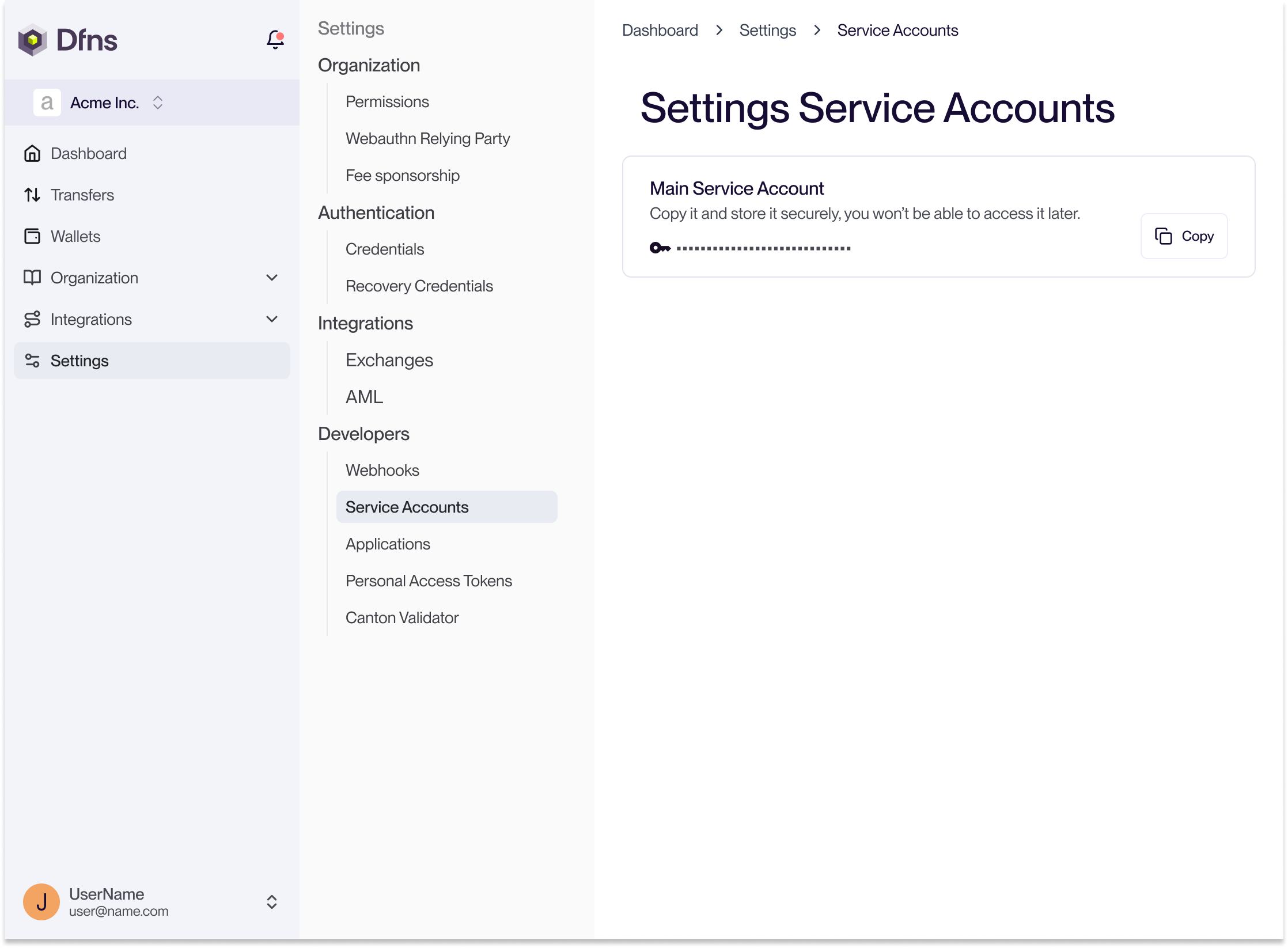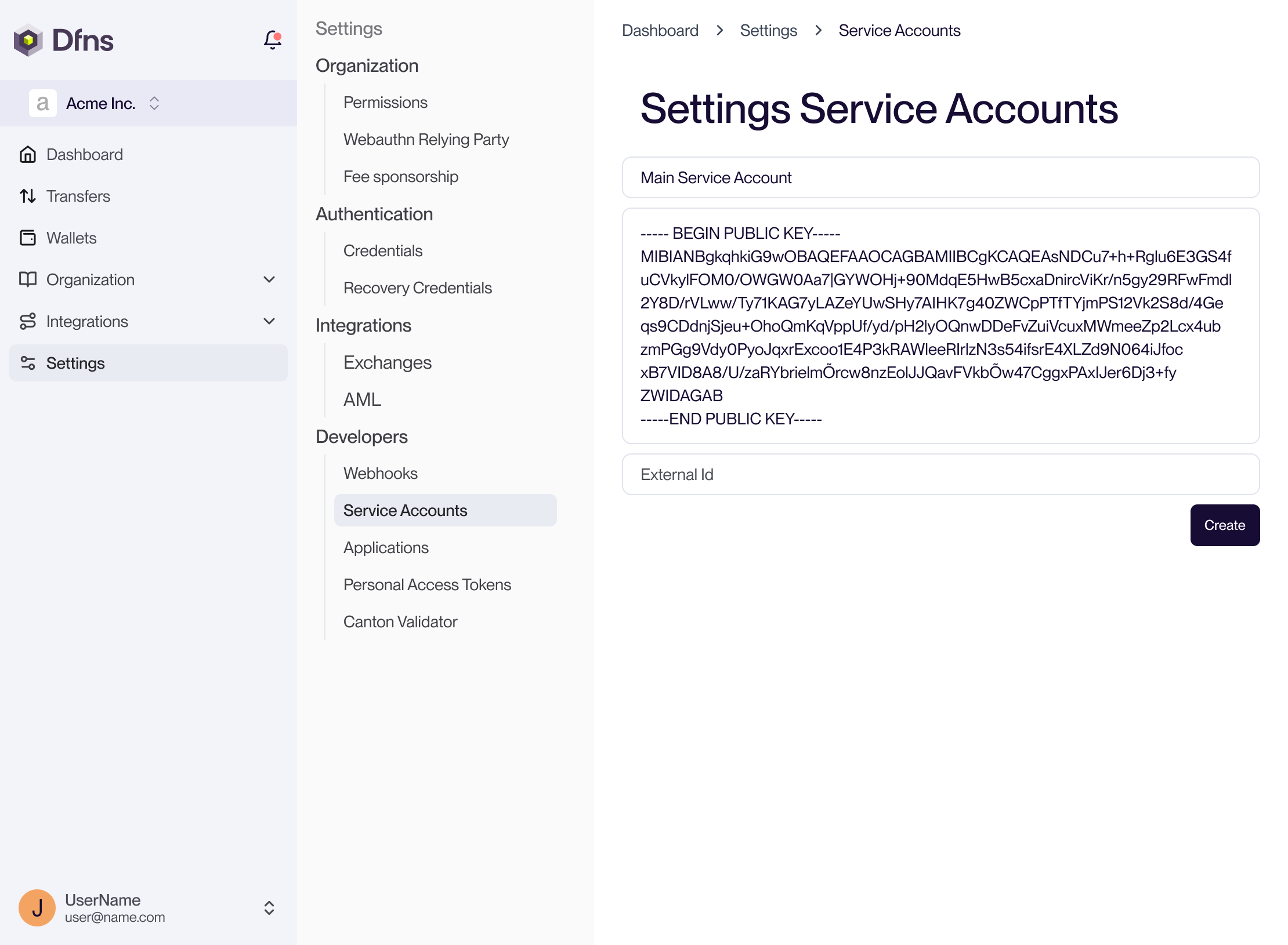 Navigate to Settings > Developers > Service Accounts and click “New Service Account”. Name the Service Account, copy in the public key (including begin/end lines like